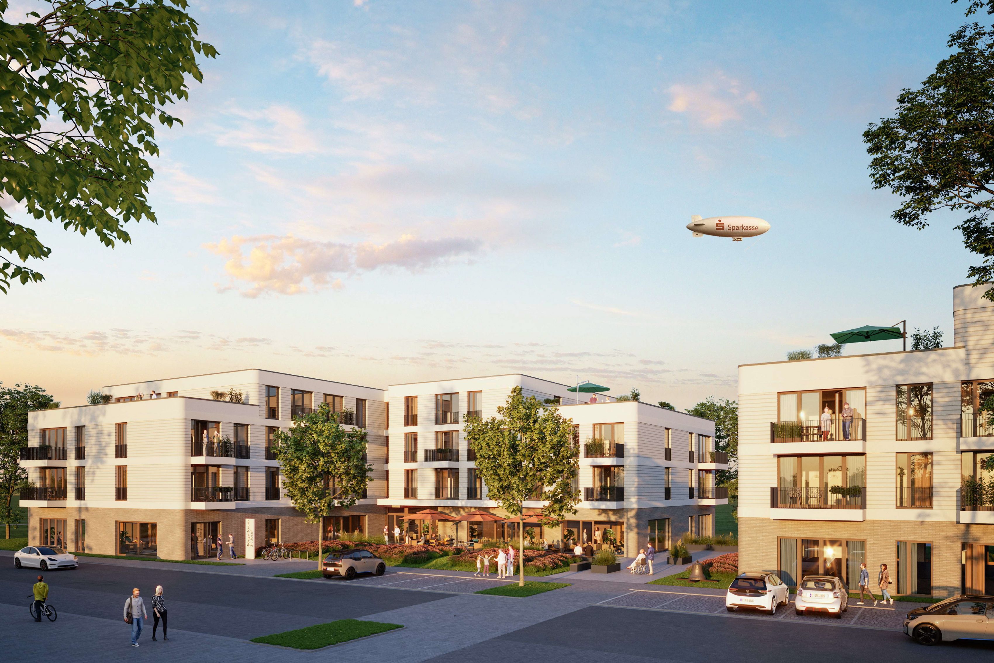 The staggered arrangement of the buildings on the property creates an inviting open space at Hinseler Feld. At the rear of the buildings, alongside the ground-level parking spaces, there are attractively landscaped, peaceful gardens that invite visitors to linger. The extensively landscaped roof areas, as well as the photovoltaic system planned for the main roof, reflect the building’s outstanding sustainability, which is being constructed to the “Climate-Friendly New Construction / Efficiency House EH 40” standard.