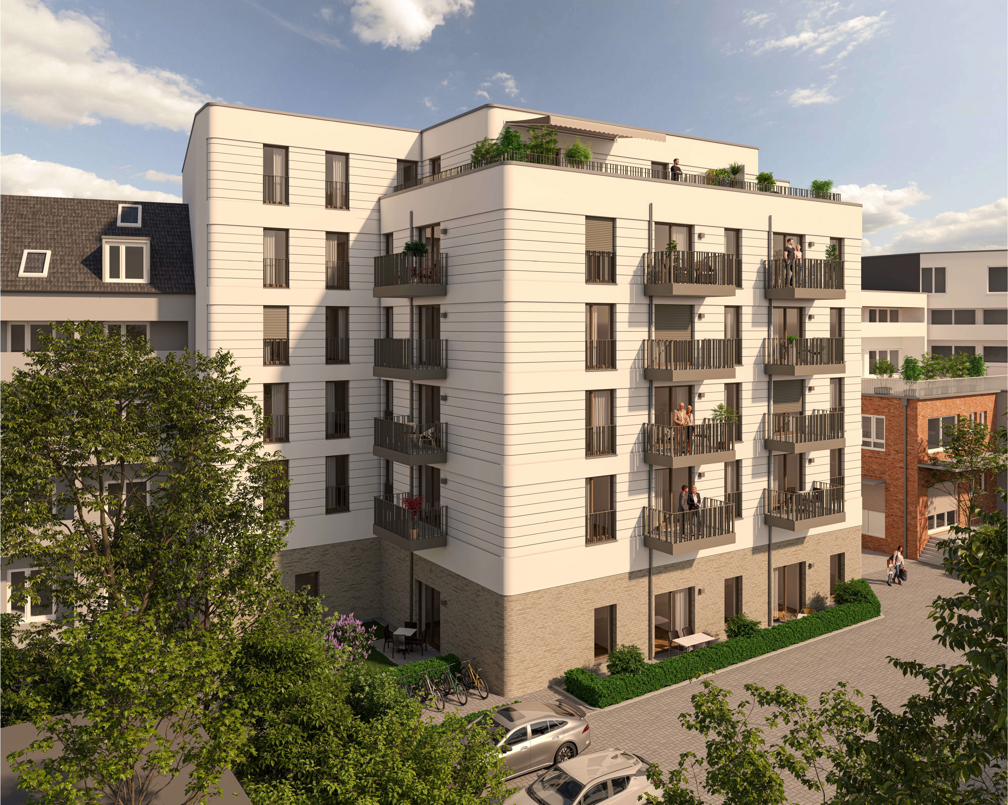 Auf der Rückseite des Gebäudes befinden sich neben den ebenerdigen Stellplätzen ansprechend gestaltete, ruhige Gärten, die zum Verweilen einladen. Die extensiv begrünten Dachflächen wie auch die auf dem Hauptdach vorgesehene Photovoltaikanlage sind Ausdruck der herausragenden Nachhaltigkeit des Gebäudes, welches im Standard „Klimafreundlicher Neubau / Effizienzhaus EH 40“ errichtet wird.