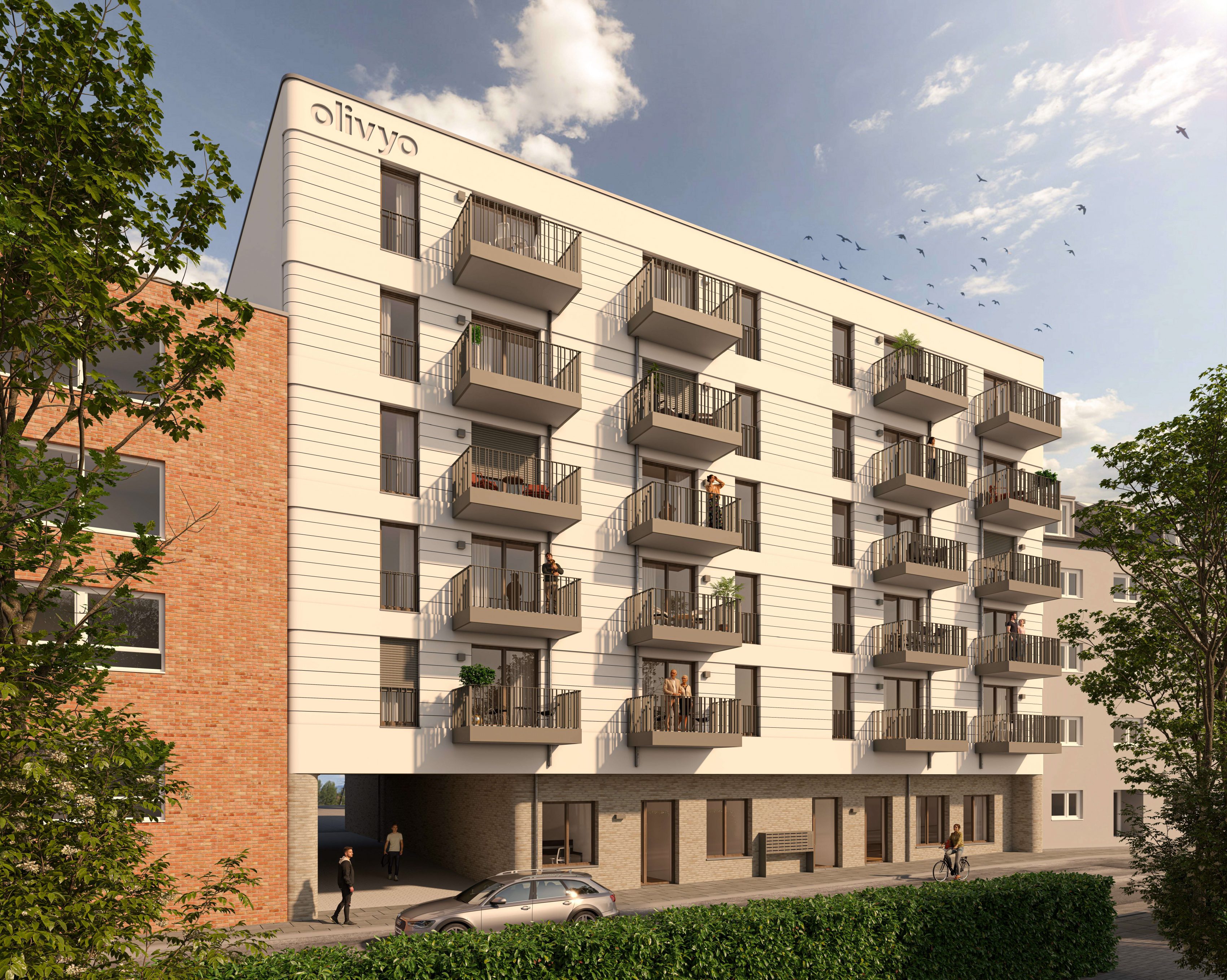 Das Wohnprojekt am Kuhlenwall im Zentrum von Duisburg vereint zeitlose Eleganz und funktionale Architektur in einem modernen, kompakten Baukörper. Das sechsgeschossige Gebäude zeichnet sich durch seine klaren, hell verputzten Fassaden aus, die durch horizontale Bänder gegliedert sind. Das Erdgeschoss ist mit passenden Klinkerriemchen abgesetzt. Die gerundeten Gebäudeecken unterstreichen zusätzlich die harmonische Architektursprache.
